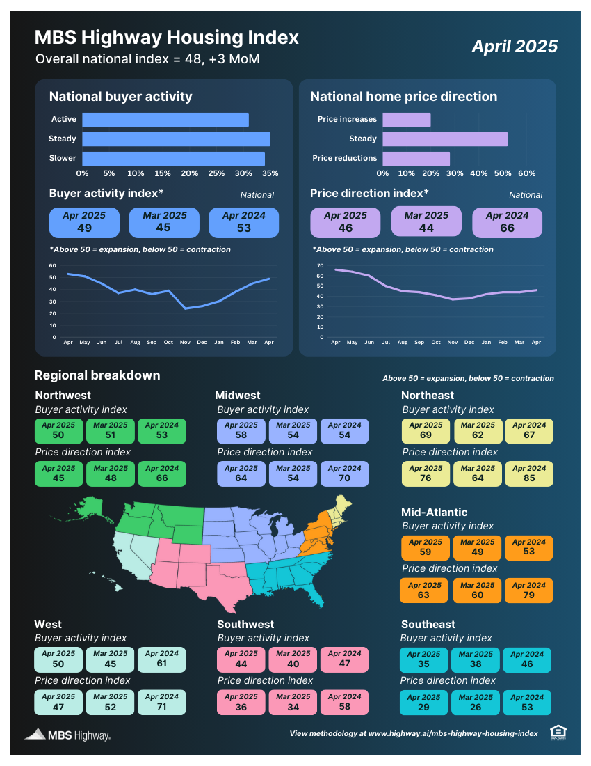 The MBS Highway National Housing Index rose three points to 48 in April 2025. While this marks the fifth-straight month of increases, buyer activity remains slightly cooler, and price direction significantly cooler, than at the same time last year.
